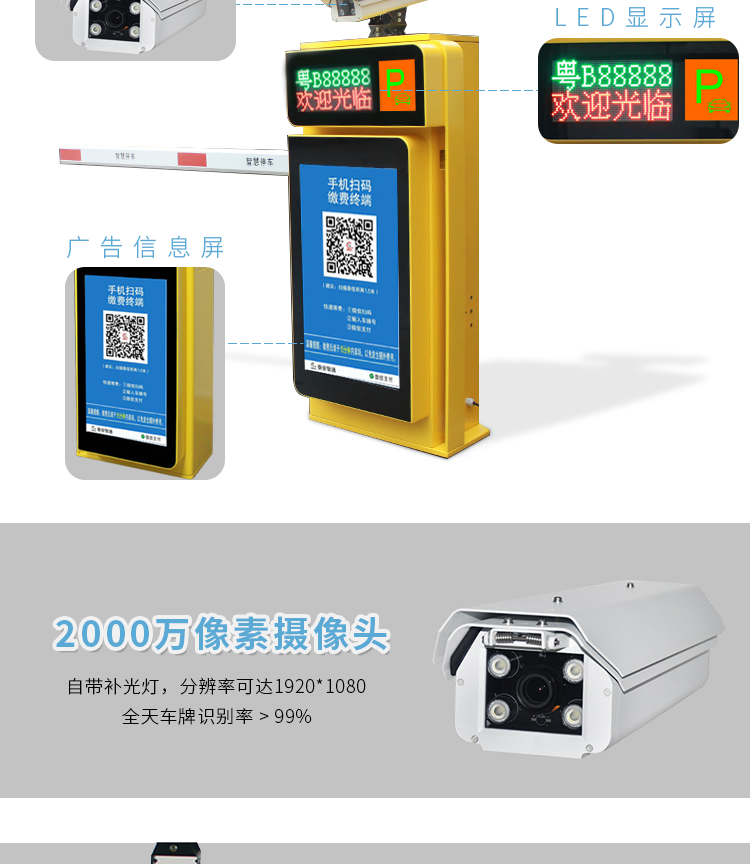 200萬像素?cái)z像頭,自帶補(bǔ)光燈,全天候車牌識(shí)別率大于99%;
