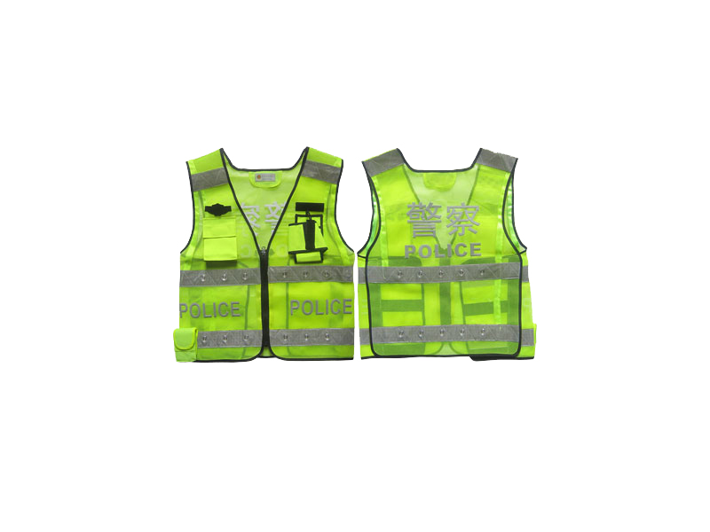 材質:熒光黃眼布反光帶:5cm晶格反材料,反光帶上鑲嵌LED燈,前擺兩側、后背反光字采用燙印工藝,前擺兩側分別印有“POLICE”,后背印有“警察POLICE”。