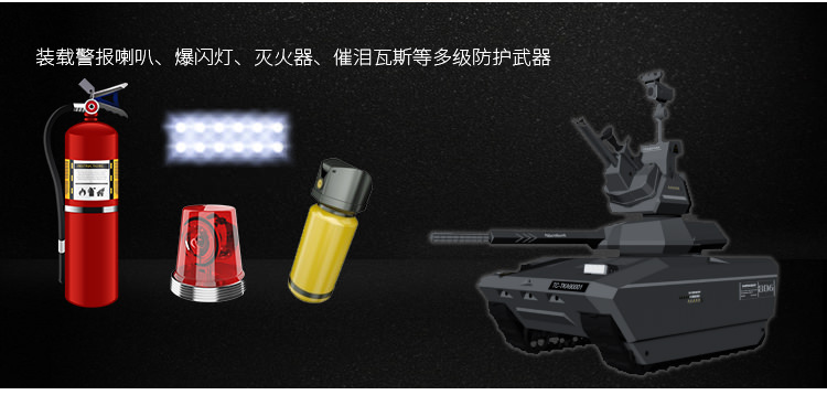 安保機(jī)器人裝載警報(bào)喇叭、爆閃燈、滅火器、催淚瓦斯等多級(jí)防護(hù)武器