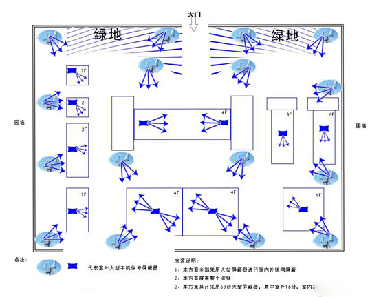 由上圖可以看出,采用新型智慧型屏蔽器,僅需4臺(tái)即可完成整個(gè)區(qū)域的無(wú)縫屏蔽,基于智慧型屏蔽的工作原理,不受周邊運(yùn)營(yíng)商基站信號(hào)的影響可以做到無(wú)縫無(wú)死角嚴(yán)格屏蔽。