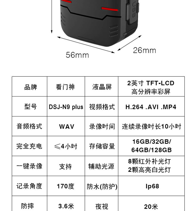 9.紅外燈及夜視: 7顆紅外燈。10米可見(jiàn)人臉,20米可見(jiàn)人體輪廓。