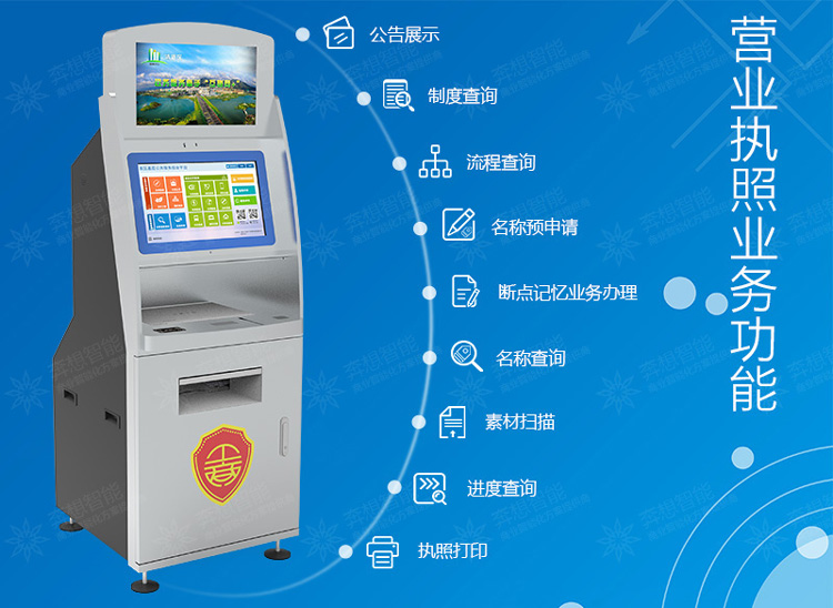工商營業(yè)執(zhí)照自助申請一體機,整合人工辦理業(yè)務申請的流程。
