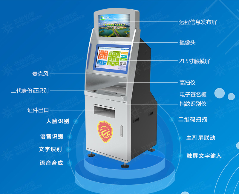 1、燈箱/信息發(fā)布屏/聯(lián)動屏;2、攝像頭;3、21.5寸紅外觸摸屏;4、高拍儀;5、指紋識別模塊;6、身份證讀卡器;7、電子簽名版;8、打印機(A3/A4);9、麥克風。